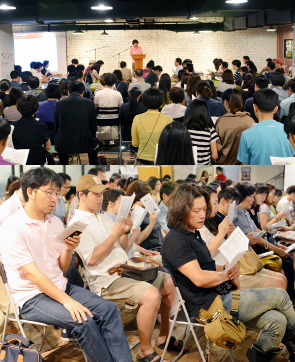 예배 순서나 분위기는 별나지 않다. 진지하면서 동시에 유쾌하다. 벙커원카페를 가득 메운 사람들은 주보에 적힌 노래를 따라 부르고 말씀을 주의 깊게 들었다. 눈에 띄는 순서는 대표기도. 기도하길 원하는 누구나 앞에 나와 기도할 수 있다. 기도 내용은 개인적인 바람과 고민이 대부분이다. 장로만 올라가 나라와 민족의 부흥과 발전을 구하는 상투적인 대표기도와 차이를 보인다.