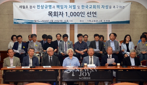 전국목회자정의평화실천협의회(목정평) 등 기독 단체들은 5월 29일 서울 종로 기독교회관에서 '세월호 참사 진상 규명과 책임자 처벌 및 한국교회의 자성을 촉구하는 목회자 1000인 선언'을 했다. 선언식에는 박형규 목사·조화순 목사·이해동 목사·유경재 목사 등 기독교계 원로들이 참석했고, 선언문에 목회자 1000여 명이 서명으로 동참했다.