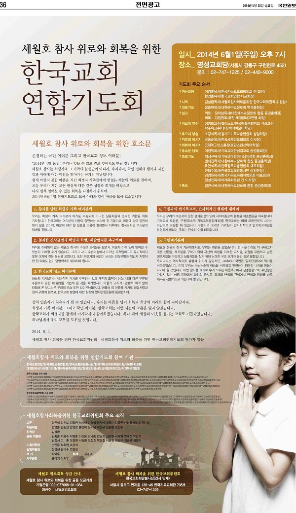 여러 논란에도 한국교회위원회는 예정된 기도회를 개최한다. 한국교회위원회는 5월 30일 자 <국민일보>에 전면 광고를 내고 '세월호 참사 위로와 회복을 위한 호소문'을 발표했다. 기도회에는 공동 설교자인 장차남 목사(예장합동 전 총회장)와 김장환 목사(극동방송 이사장) 등 전현직 교단·기관장 16명이 주요 순서를 맡는다.