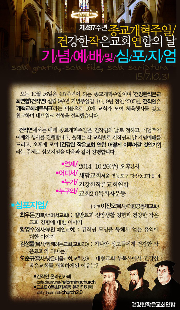 건강한작은교회연합(건작연)은 26일 종교개혁 주일을 맞아 당일에 심포지엄을 한다. 매해 종교개혁 주일을 건작연의 날로 정한 이들은 이날 오후 3시, 새맘교회에서 '건강한 작은 교회 연합을 어떻게 이뤄 갈 것인가?'라는 질문을 두고 이야기를 나눈다.