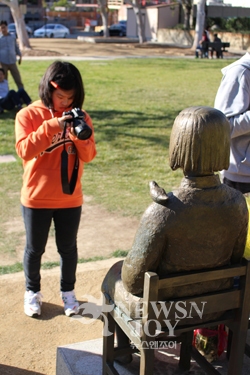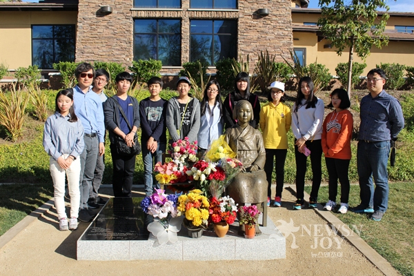 이곳에 소녀상이 세워진 때는 2013년 7월 30일이니까, 우리가 방문하기 5개월 전입니다. 일본인들은 소녀상이 건립되자마자 그것을 철거하라고 시의회에 로비하고 서명운동을 벌였습니다. 우리가 이곳을 들르기 직전에 철거 운동이 거셌고, 짧은 기간에 10만 명이 넘는 일본인들이 소녀상을 없애라는 청원에 서명했습니다. 일본이 제2차세계대전 때 자신이 식민지로 만든 여러 국가의 수많은 여자들을 성노예로 삼은 것은 천하가 다 아는 역사적 진실입니다. 일본 자신만 부인하고 있습니다. 우리나라에도 수십만 명의 희생자들이 계십니다. 안타깝게도 일본의 진지한 사과와 배상을 제대로 받지 못한 채 한 분 두 분 세상을 떠나고 있습니다. 우리가 이분들의 고통에 무관심해서는 안 됩니다.