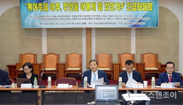 한국교회동성애대책위원회가 주최한 '퀴어 축제 이후, 무엇을 어떻게 할 것인가?' 긴급 좌담회가 7월 1일 한국기독교회관에서 열렸다. 한국교회동성애대책위원회 본부장 소강석 목사(새에덴교회), 동성애에이즈예방연구소 부소장 이병대 목사(한국교회언론회), 에스더기운동본부 이용희 대표를 포함 100여 명이 참석했다.