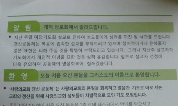 당신들이 존경했던 옥한흠 목사님도 은퇴 후 2007년 '어게인 1907 기념 집회'에서 "내가 교인들 무서워 성경대로 설교하지 못한 것을 회개한다"고 피를 토하듯 고백했다고 말했다. 바로 당신들이 옥 목사님을 두렵게 만든 당사자 아닌가라는 아픈 이야기도 빼놓지 않았다. 아프게 들었는지는 모르겠다.