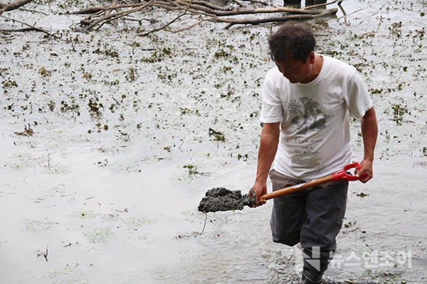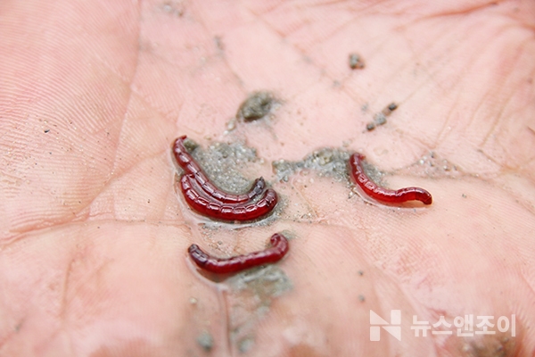[뉴스앤조이-구권효 기자] 검은 진흙 뭉치를 바닥에 한 삽 '퍽' 내려놓고는 말한다. 그것도 모자라 그 검은 뭉치를 맨손으로 집어 뭉개 보고 냄새까지 맡는다. 찐득한 퇴적토 사이에서 손톱만 한 붉은 애벌레 몇 마리가 나온다. 그걸 또 맨손에 올려놓는다.