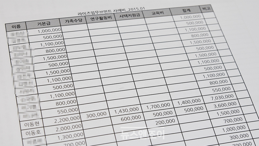 2011년부터 살펴보자. 2011년 라이즈업 1년 예산은 약 12억 6,000만 원이었다. 이동현 씨는 매월 520만 원에서 550만 원을 꾸준히 받아 갔다. 기본급 200만 원, 가족 수당 30만 원, 연구 활동비 명목으로 90만 원을 받았다. 사택 지원금도 200만 원이나 됐다. 2011년 12월에는 교육비가 추가돼 약 703만 원을 지급받았다. 이 금액은 2016년까지 비슷한 수준으로 유지된다.