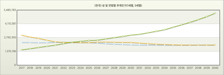통계청이 발표한 '성 및 연령별 추계 인구 통계'를 보면, 80세 이상 인구가 2020년에 188만 명, 2040년에 510만 명으로 증가하는 것으로 나온다. 반면 같은 기간 10대 인구는 473만 명에서 404만 명으로, 70만 명 감소한다.