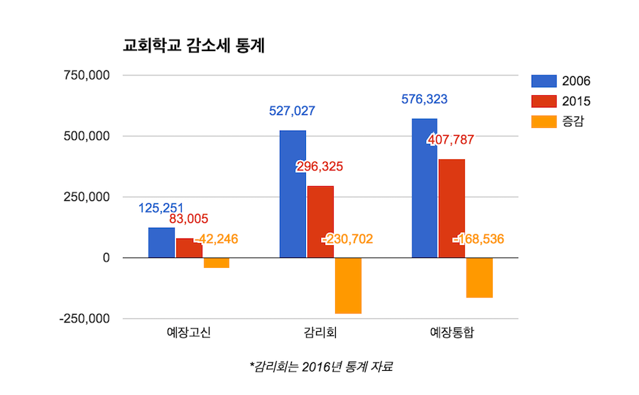 대형 교단에 속하는 대한예수교장로회 통합(예장통합·이성희 총회장), 기독교대한감리회(감리회·전명구 감독회장) 교세 통계 보고서를 보면, 최근 10년간 교회학교 인구가 30~40% 이상 감소했다.