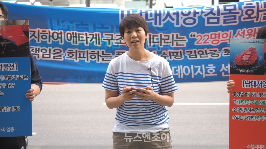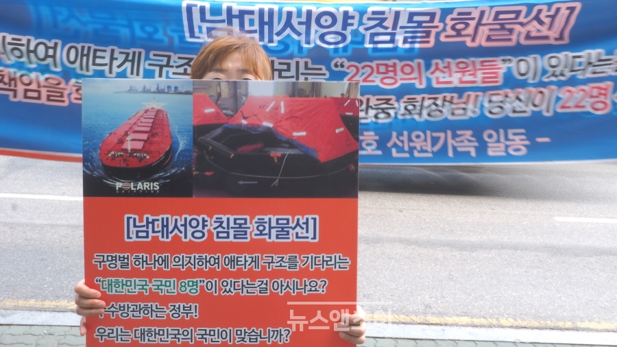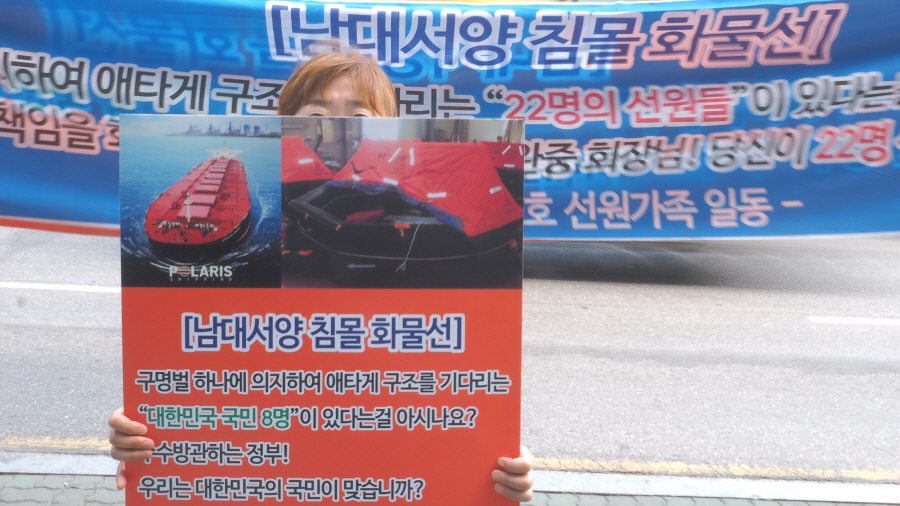 [뉴스앤조이-유영 기자] 스텔라데이지호 실종자 가족이 5월 4일부터 길거리 시위에 나섰다. 선사 폴라리스쉬핑이 5월 3일 '유족보상' 논의를 시작하겠다며, 가족 상황실을 폐쇄한다고 통보했기 때문이다. 실종자 가족들은 "보상 이야기보다 실종자들이 타고 있을 구명벌 수색에 더 힘써야 한다. 구명벌이 스텔라데이지호에 걸려 펼쳐지지 못했다는 사실이라도 심해 수색 장비로 확인하라"고 했다.