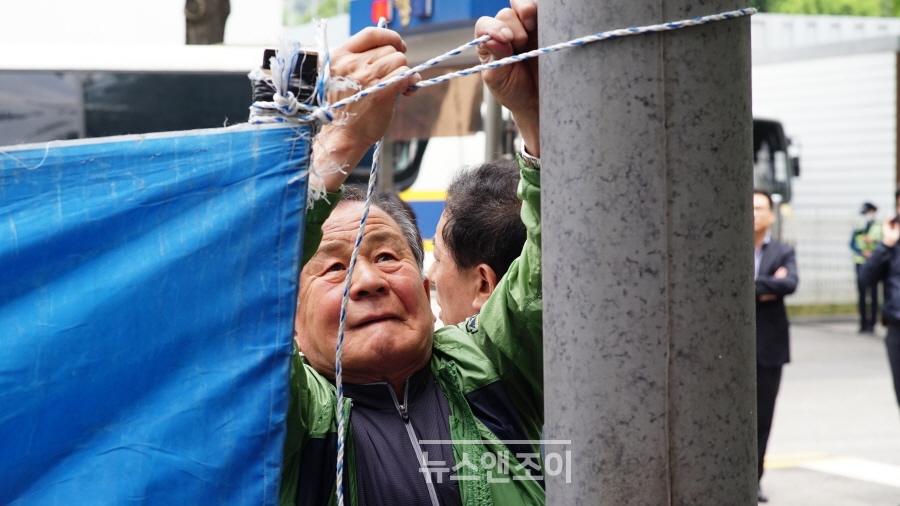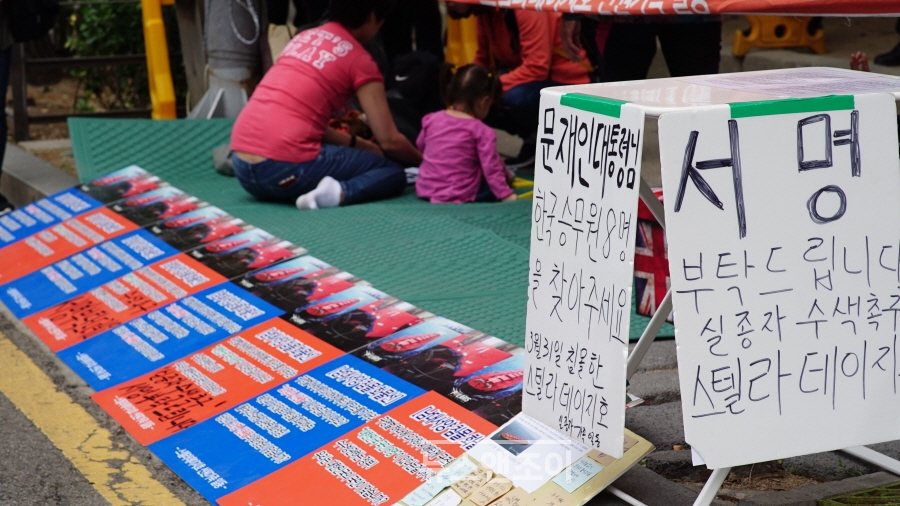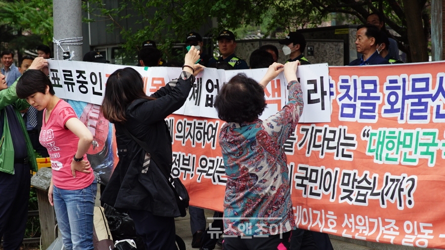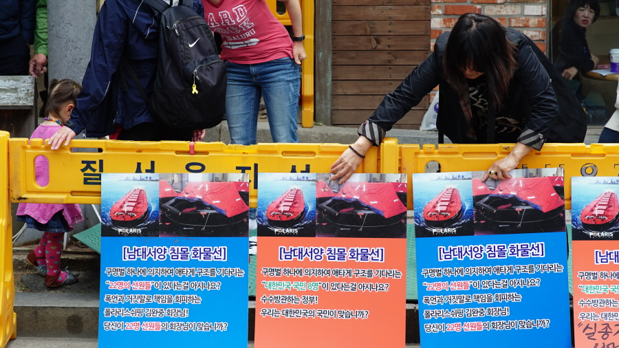 가족들은 처음 길거리에 나섰을 때보다 시위에 익숙해진 모습이었다. 시위 장소에 도착하자 자동차에서 현수막과 피켓, 돗자리, 서명 용지 등을 빠르게 내렸다. 실종자 아버지들은 바로 현수막을 달았다. 실종자 어머니들은 현수막 위에 붙일 '표류 중인 구명 뗏목 지체 없이 수색하라', '선원들은 살아 있다 조속히 구조하라'는 문구를 테이프로 연결했다. 피켓과 함께 수색 재개를 청원하는 서명 용지도 배치했다.