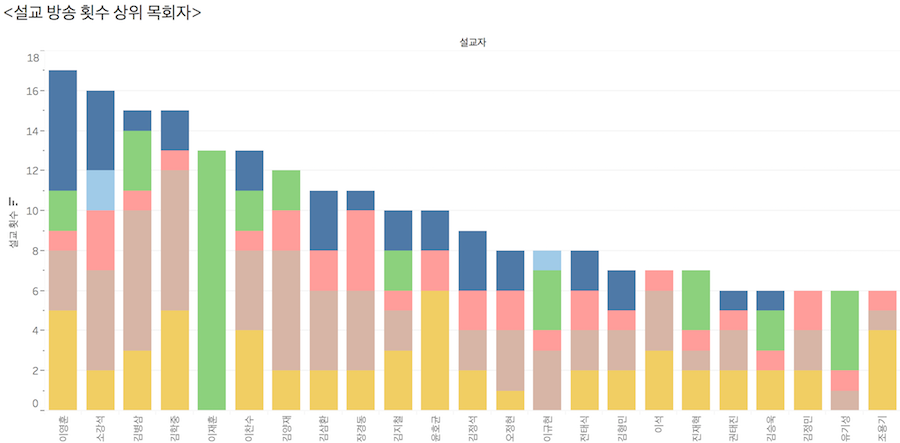 소강석 목사(새에덴교회)가 16회로 이영훈 목사 뒤를 이었다. 소 목사 설교는 CGNTV를 제외한 방송사 4개와 지역 방송사 광주CBS에서 볼 수 있다. 김병삼(만나교회)·김학중(꿈의교회) 목사가 15회였고, 이찬수(분당우리교회)·이재훈(온누리교회) 목사가 뒤를 이었다. 다만, 이재훈 목사 설교는 CGNTV에서만 방송된다. 타 교회 방송 설교 비중이 낮고 온누리교회 예배 실황 중계 비중이 높은 CGNTV 특성이 반영됐다. 이외 오정현 목사(사랑의교회)는 8회(CTS 2회, CBS 2회, C채널 3회, GOODTV 1회), 윤석전 목사(연세중앙교회)는 3회(CTS 2회, CBS 1회)였다.