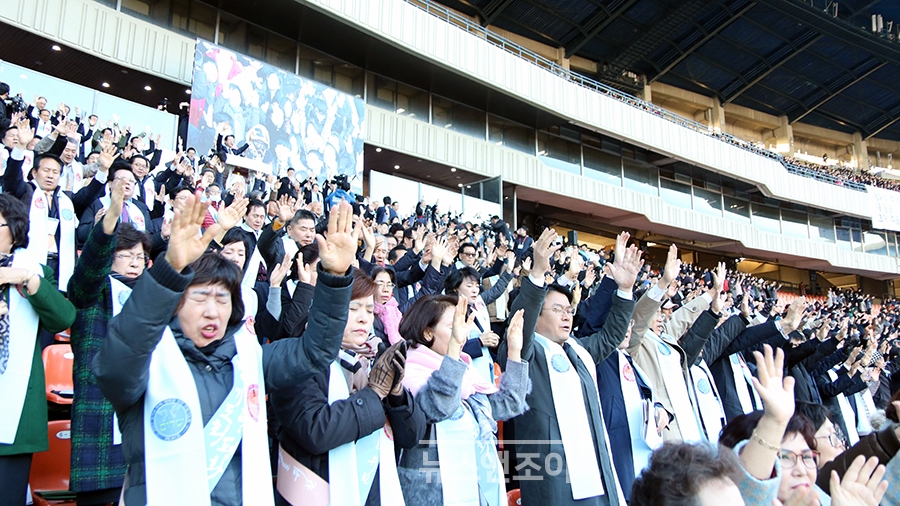 [뉴스앤조이-최승현 기자] '국가와 민족, 평화를 위한 한국교회 연합 기도회'가 11월 12일 잠실 올림픽주경기장에서 열렸다. 북한 핵실험 등 안보 위기와 전쟁 위협에서 한국을 구해 달라고 기도하는 자리였다.