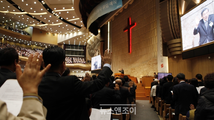 "이 위임식은 무효입니다! 명성교회는 총회 법을 어기고 있습니다! 하나님, 명성교회를 용서해 주십시오! 하나님…"