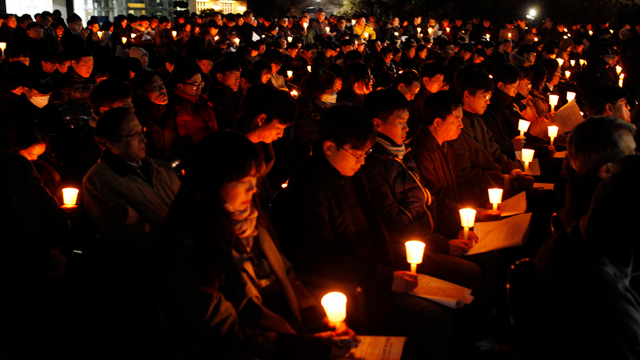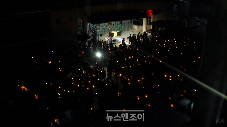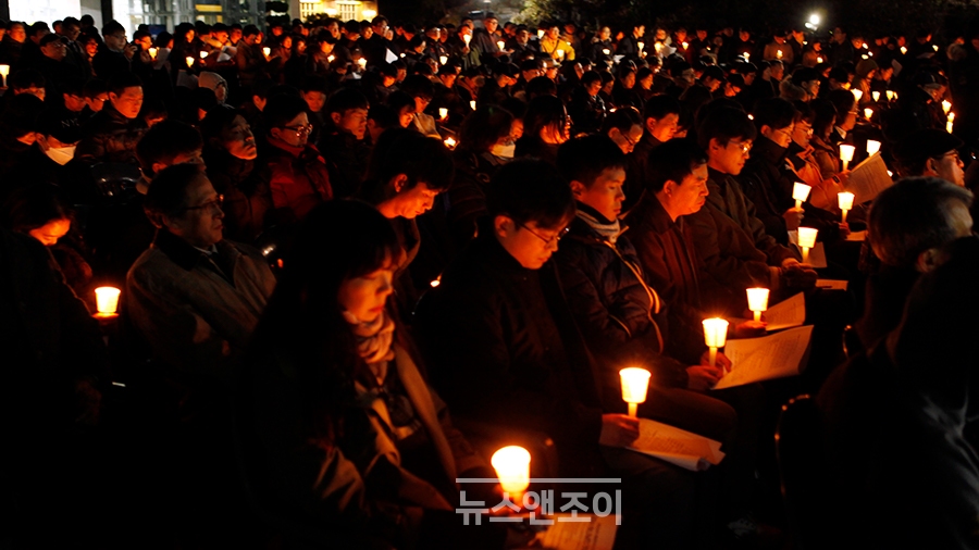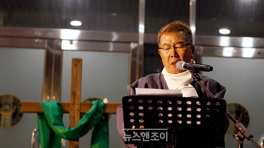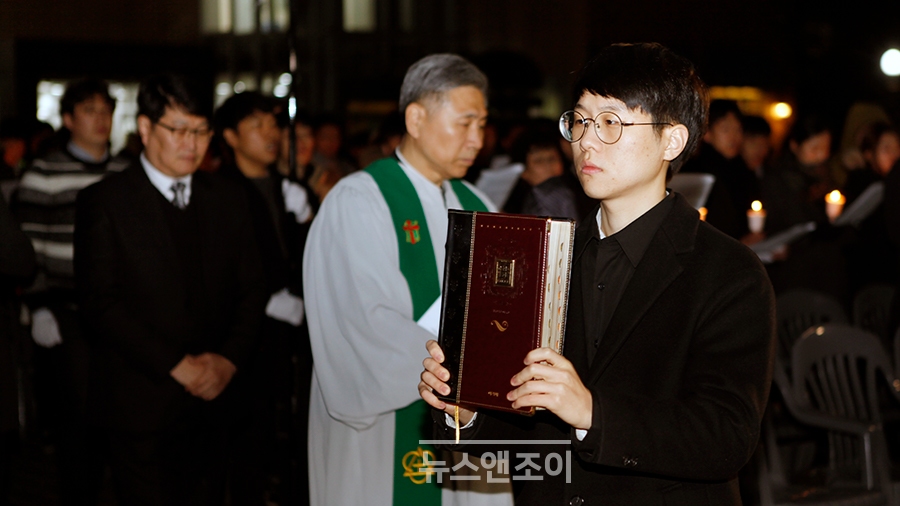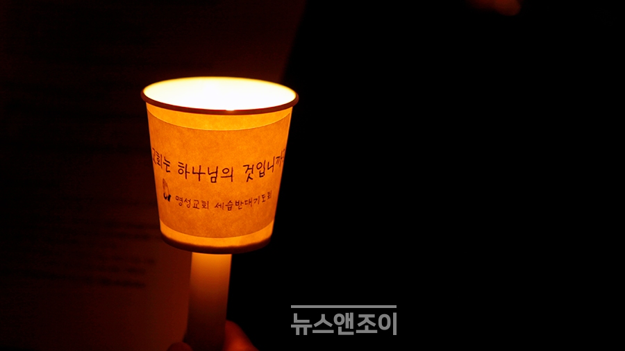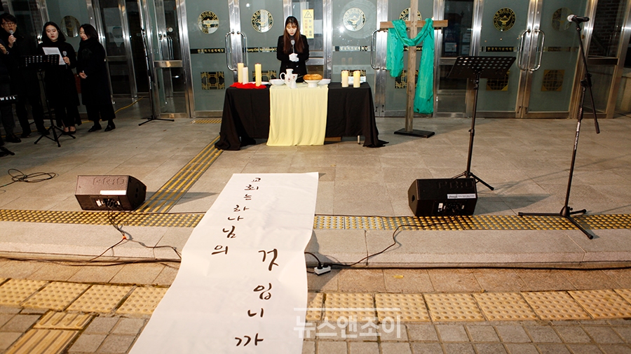 [뉴스앤조이-박요셉 기자] 인도자와 회중이 순서지에 있는 글을 교독했다. 교독이 끝나자 인도자는 타종으로 기도회 시작을 알렸다. 한 무리가 회중 사이를 가로질러 강단 앞으로 천천히 걸어 나왔다. 맨 앞사람은 십자가를, 그 뒷사람은 율법을 의미하는 두꺼운 책을 들었다. 강단 앞에는 하얀 천이 펼쳐져 있었다. '교회는 하나님의 것입니까?'라는 문구가 쓰여 있었다.