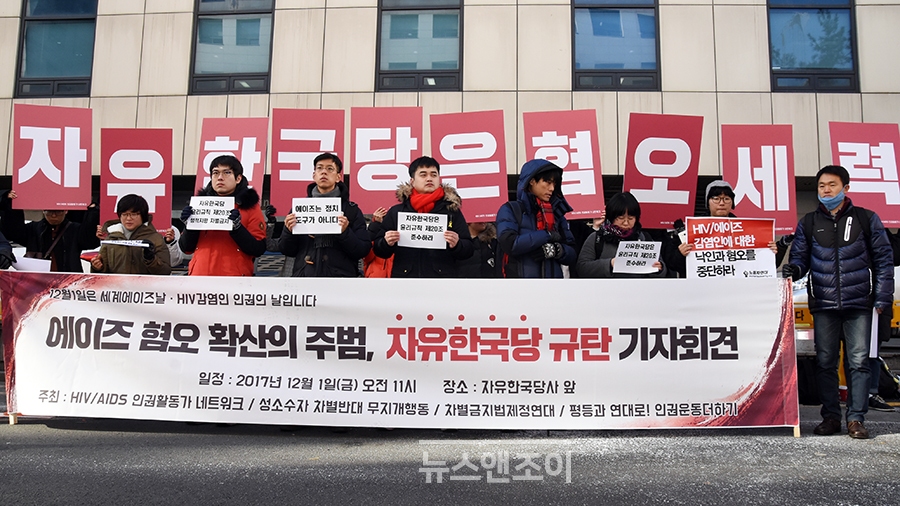 '세계 에이즈의 날' 제정 30주년을 맞아 자유한국당의 혐오 발언을 규탄하는 기자회견이 열렸다. 전 세계는 12월 1일을 '에이즈의 날'로 정해 HIV 감염 예방과 확산 방지, 감염인이 건강하게 생활할 권리 등을 알리는 날로 지켜 오고 있다. 한국도 해마다 에이즈의 날을 기념하기는 하지만 서구 여러 나라처럼 적극적인 움직임은 없다.