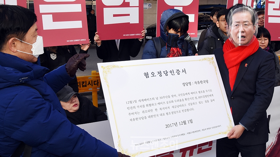 HIV/AIDS인권활동가네트워크는 12월 1일 서울 자유한국당 당사 앞에서 AIDS 혐오에 앞장서는 자유한국당을 규탄했다. 자유한국당은 보건복지위원회 국정감사에 염안섭 원장(수동연세요양병원)을 참고인 자격으로 불렀다. 두 의원은 염 원장과 질문을 주고받으며 "AIDS가 무섭고 치명적인 질병"이라는 인식을 확산했다.