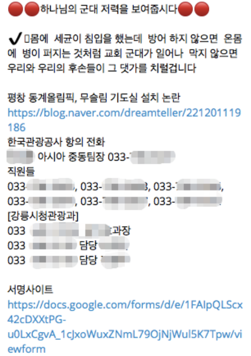 이들은 항의 전화할 때 참고하라며 개신교 반동성애 진영 온라인 커뮤니티에 올라온 게시물 주소를 공유했다. 게시물에는 '무슬림 기도실 설치 반대 서명' 링크가 있다. '평창올림픽이슬람대책강원도민운동본부'라는 단체가 받는 서명에는 2월 5일 오후 6시 기준, 약 2만 7000명이 참여했다. 이들은 "무슬림 기도실은 특정 종교 특혜이며, 건전한 생각을 가진 국민을 힘들게 만드는 일"이라고 했다.