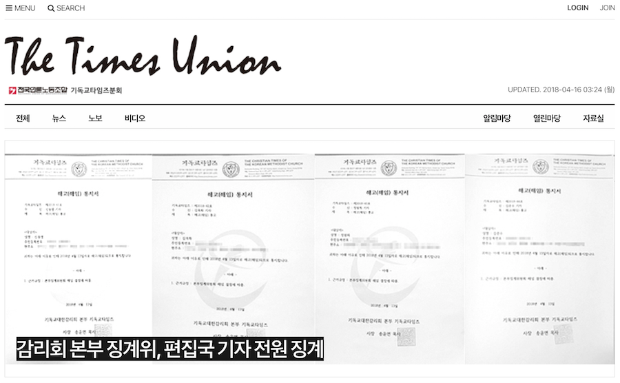 [뉴스앤조이-최승현 기자] 기독교대한감리회(감리회·전명구 감독회장)가 교단지 <기독교타임즈> 소속 기자 5명을 해고하고 1명을 정직하는 등 편집국 기자 전원을 징계했다. 지난해부터 전명구 감독회장의 '편집권 침해' 논란이 이어졌다는 점에서, 보복성 인사 의혹이 불거지고 있다.