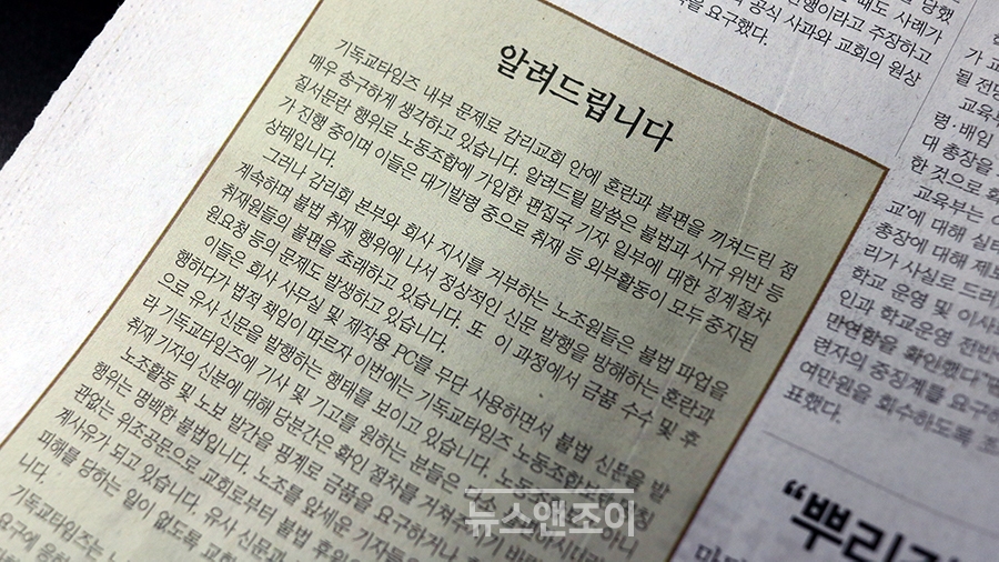 <기독교타임즈>는 4월 14일 자 신문에 "감리회 본부와 회사 지시를 거부하는 노조원들이 불법 파업을 계속하며 불법 취재 행위에 나서 정상적 신문 발행을 방해하고 있다"며 "노보라는 명칭으로 유사 신문을 발행하는 행태를 보이고 있으니 현혹돼 피해 당하는 일이 없도록 각별한 주의를 부탁한다"는 공고를 냈다.