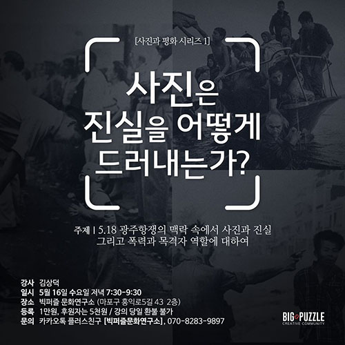 사진은 이 세 가지 기억과 어떤 관계가 있을까요. 역시나 상반된 두 가지 기능이 있습니다. 사진은 진실을 드러내기도 하고 왜곡하기도 합니다. 사진은 치유를 돕기도 하지만 상처를 주기도 합니다. 화해도 마찬가지입니다. 필자가 빅퍼즐문화아카데미 강좌를 통해 나누고 싶은 이야기를 요약하면, 사진을 보지 말고 읽으라는 것입니다. 즉 사진을 수동적으로 보고 단순하게 믿기보다 적극적이고 비평적으로 해석하는 안목을 길러야 한다는 것입니다.
