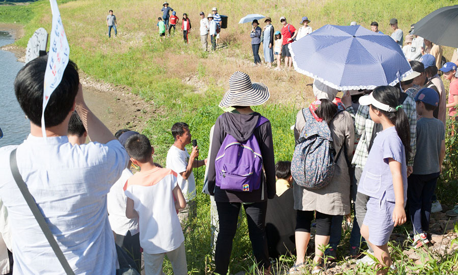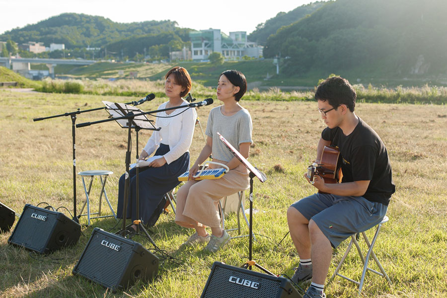 김종술 기자의 안내가 끝나고, 길벗들은 둔치로 올라서서 수상공연장에서 기도회를 했다. 햇살이 뜨거웠지만, 뜨거운 기운을 받으며 뜨거운 마음으로 노래하고 기도했다. 4대강 사업이 파괴한 금강과 금강 주변의 공동체들. 금강이 흐르면서 스스로 회복하듯, 파괴된 공동체도 생명들도 다시 회복되어 돌아오기를 바라며 기도했다. 기도회 이후 금강 작은소리 음악회가 열렸다. 3월 제주 순례부터 꾸준히 작은소리에 참여하고 있는 길벗, 학교에서 우연한 기회에 같이 노래하다가 함께 나누고 싶어 참여한 학생들과 선생님, 마을에서 풍물을 배우는 학생들과 이모·삼촌들, 강원도 홍천 밝은누리움터 선생님과 서울 인수동에 사는 직장인 등 여러 길벗이 참여해 생명 평화 기운을 담은 노래 나누며 기도 순례 걸음에 힘을 더했다.