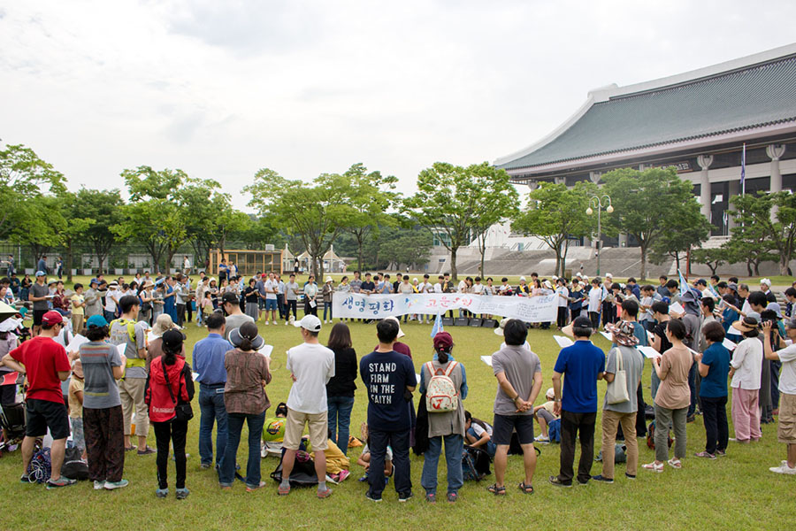 오후에는 독립기념관 겨레의집 앞에서 생명 평화를 구하는 기도회가 열렸다. 식민 지배라는 현실 앞에서 자주독립과 세계 평화를 꿈꾸었던 선열들의 희생과 지금의 한반도와 동북아 정세를 떠올리며 기도했다. 우리가 우리 운명을 스스로 헤치고 나아가지 못했던 과거와 달리 새로운 전환의 때가 다가오고 있다. 하나님께서 열어 주시는 새로운 기회와 변화를 감사하는 마음으로 받아들이고, 우리의 삶으로 그것을 살아 내기를 기도하는 길벗들의 얼굴에 희망이 피어났다. 생명 평화 고운 울림 기도 순례는 7월 태백으로 이어진다.
