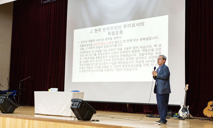 기도 순례 이튿날인 17일 오전 10시. 천안 독립기념관 컨벤션홀에서 '온전한 독립, 하나 된 겨레와 동북아 평화'라는 주제로 모셔 배움이 열렸다. 이준식 독립기념관장이 강의했다.