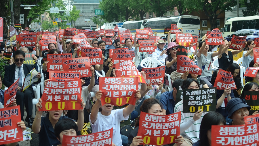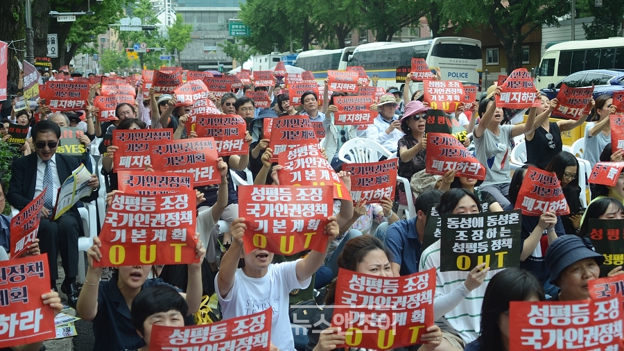 반동성애 진영은 법무부가 2018년 4월 발표한 NAP를 폐지해야 한다고 주장한다. NAP 내에 '양성평등'이 아닌 '성평등'이라는 단어를 사용한 것에 문제를 제기하고 있다. 이들은 NAP 통과가 동성애와 동성혼 합법화로 이어진다며 반대해 왔다.