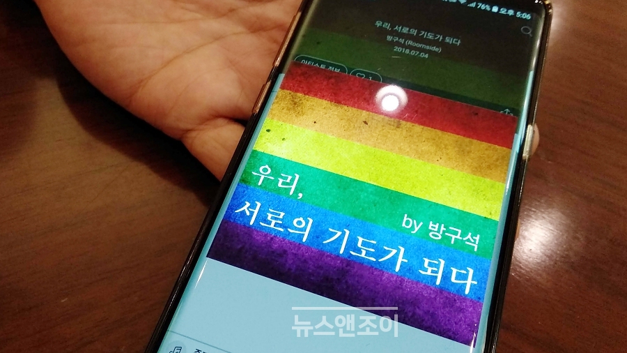 [뉴스앤조이-이은혜 기자] 싱어송라이터 '방구석'(활동명)이 7월 4일 발표한 CCM '우리, 서로의 기도가 되다' 가사다. 2014년부터 CCM 가수로 활동해 온 그는 5월 17일 '국제 성소수자 혐오 반대의 날'을 맞아 열린 '정체성 강제 전환 시도 근절을 위한 기도회'에서 누군가 읽어 내려간 기도를 듣고 곡을 쓰기로 결심했다.