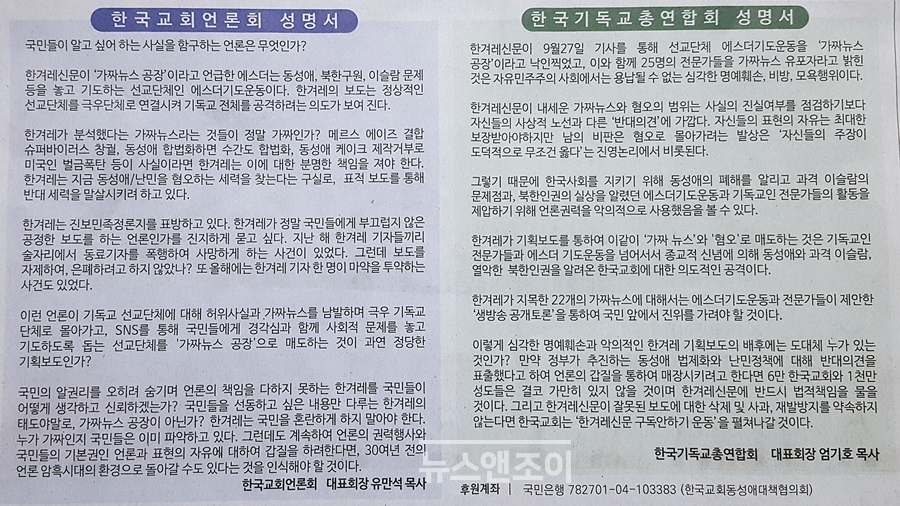 한기총·교회언론회, 에스더 옹호…"보도 사과·삭제 안 하면 '구독 안 하기 운동'"