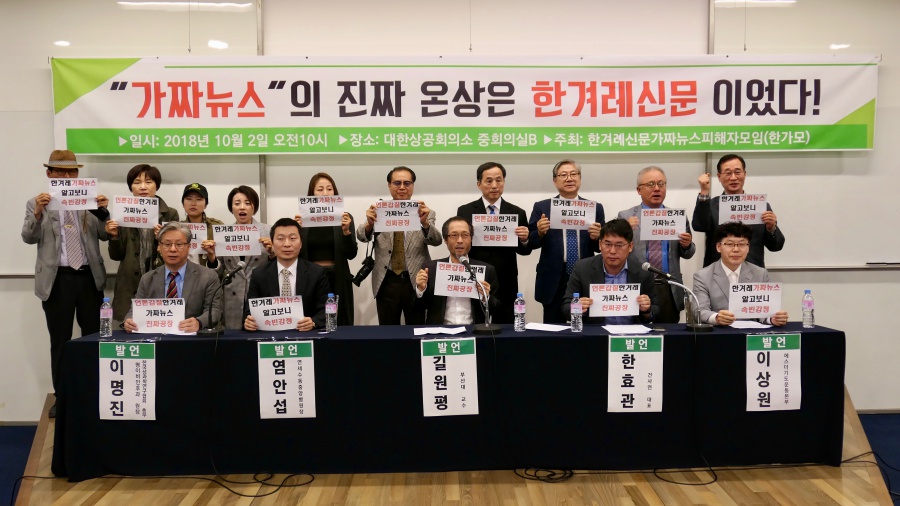 [뉴스앤조이-장명성 기자] <한겨레>가 가짜 뉴스 배포자로 지목한 25명이 한겨레가짜뉴스피해자모임(한가모)을 만들고, 10월 2일 대한상공회의소에서 기자회견을 열었다. 이들은 <한겨레>와의 공개 토론회를 요구했다.