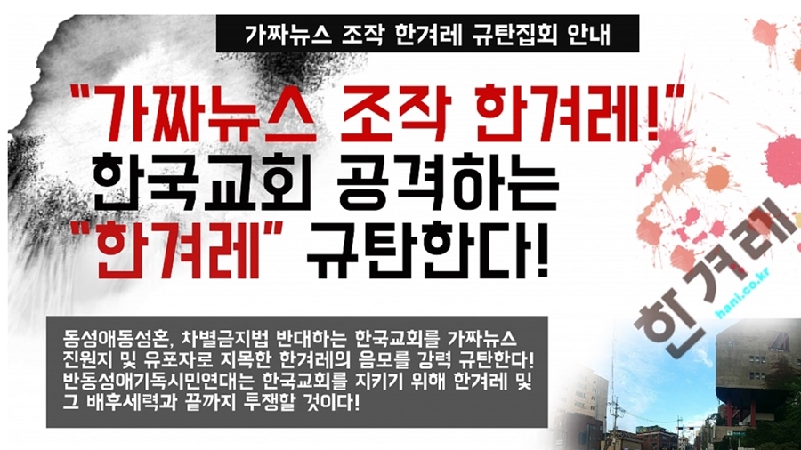 [뉴스앤조이-이용필 기자] 반동성애기독시민연대가 <한겨레> 규탄 집회를 10월 8일 한겨레신문사 앞에서 개최한다고 밝혔다. <한겨레>가 에스더기도운동본부(이용희 대표)를 '가짜 뉴스' 공장으로 지목하고 지속적으로 보도해 온 것에 반발한 것이다.