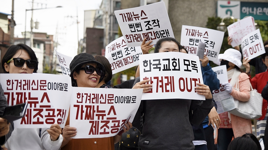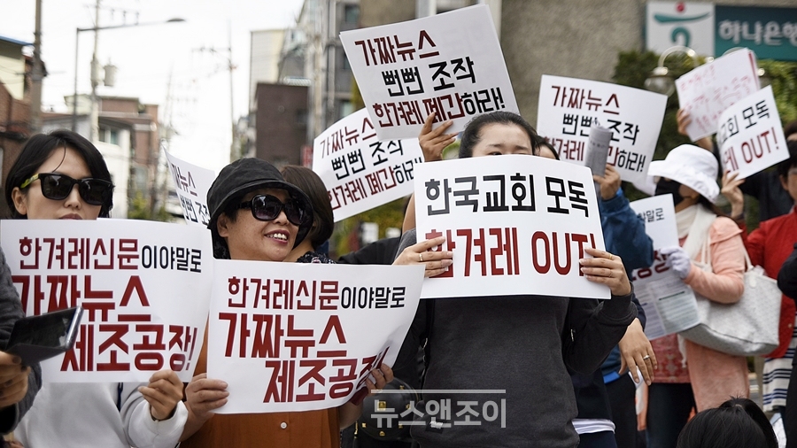 반동연이 주최한 <한겨레> 규탄 집회는 10월 8일, 서울 공덕동 한겨레신문사 앞에서 열렸다. 집회 참가자 50여 명은 '가짜 뉴스 뻔뻔 조작 한겨레 폐간하라', '한국교회 모독 한겨레 OUT', '한겨레 신문이야말로 가짜 뉴스 제조 공장' 문구가 적힌 피켓을 들었다.