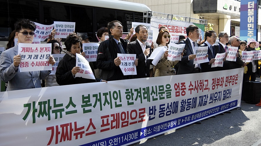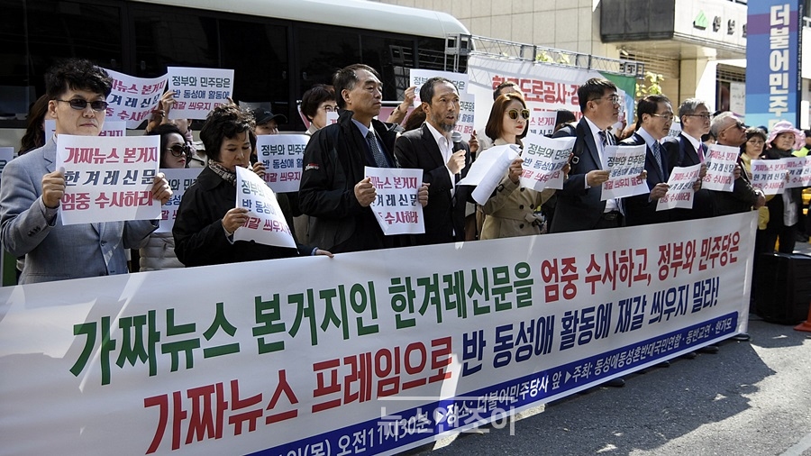 동성애동성혼반대국민연합·동성혼합법화반대전국교수연합·한겨레가짜뉴스피해자모임은 10월 11일 서울 여의도 더불어민주당 당사 앞에서 규탄 집회를 열었다. 참가자 40여 명은 <한겨레>를 규탄했다. 동시에 정부와 민주당이 "반동성애 활동에 재갈을 씌우려 한다"고 주장했다.