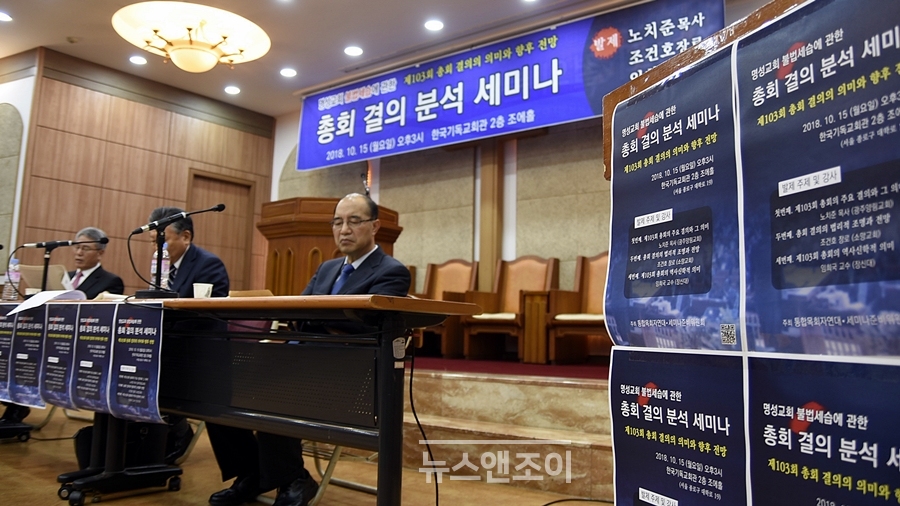 [뉴스앤조이-이용필 기자] 명성교회 김삼환·김하나 부자 세습을 반대하며 목회자 대회와 기도회 등을 주최해 온 예장통합목회자연대가, 103회 총회에서 가장 큰 이슈가 된 명성교회 세습을 돌아보는 '총회 결의 분석 세미나'를 10월 16일 서울 종로 기독교회관에서 열었다.