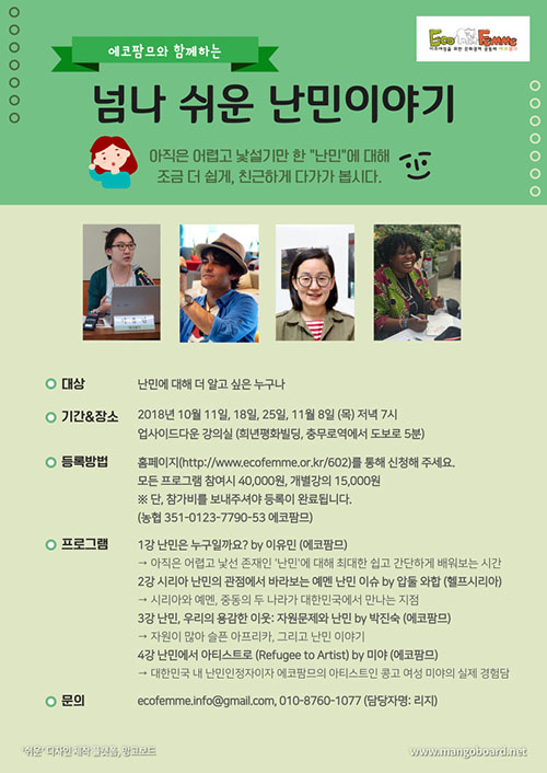 난민에게는 그 나름대로 이야기가 있다. 문득 가려진 이야기들이 알고 싶어졌다. 내가 대표로 일하는 에코팜므에서 같이 공부하자는 취지로 '넘나 쉬운 난민 이야기' 강좌를 진행 중이다. 이번 목요일 10월 18일에는 헬프시리아 압둘 와합 사무국장이 와서 '시리아 난민의 관점에서 바라보는 예멘 난민 이슈'라는 주제로 강의한다. 한국어를 잘해서 통역도 없다. 놓치면 아까운 기회이니 한 분이라도 더 함께했으면 좋겠다.