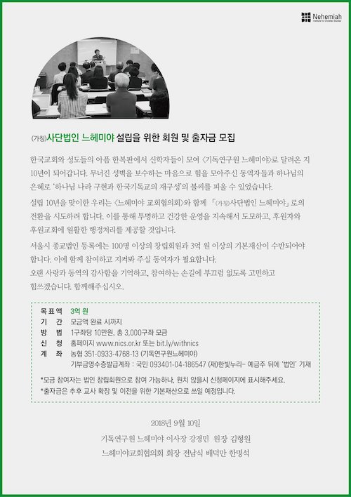 기독연구원느헤미야는 9년 전, 평신도를 대상으로 기독교학 입문 과정을 시작했다. 이어서 목회자 과정이 생기고, 전국과 해외로 확장하고 있다. 점점 틀이 넓어지는 과정에서 재정적 규모도 커지게 됐다. 개인 후원자만 900명에 가깝고, 교회·기관도 매달 후원금을 보내오고 있다. 회계나 재정 처리를 투명하게 공개하고 있지만 내부적으로만 진행하기 쉽지 않게 됐다.