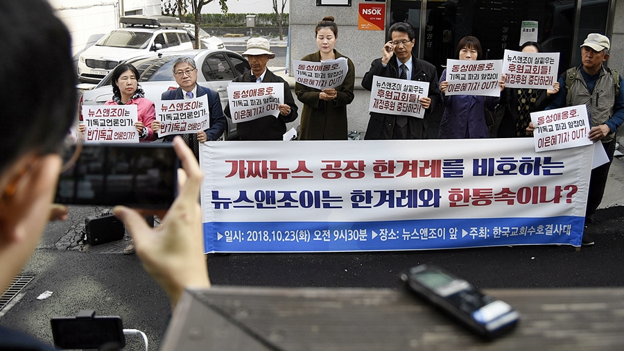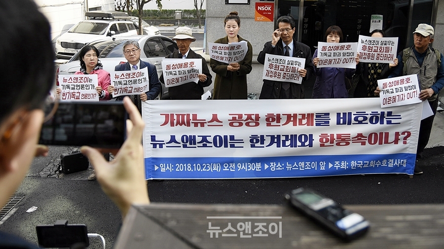 한수대는 10월 23일 서울 중구 필동 <뉴스앤조이> 사무실 앞에서 규탄 기자회견을 열었다. 주요셉 목사(반동성애기독시민연대)를 포함해 9명이 모여 피켓을 들었다. 이들은 '뉴스앤조이는 기독교 언론인가 반기독교 언론인가?', '뉴스앤조이 살찌우는 후원 교회들! 재정 후원 중단하라'고 적힌 피켓을 들었다.