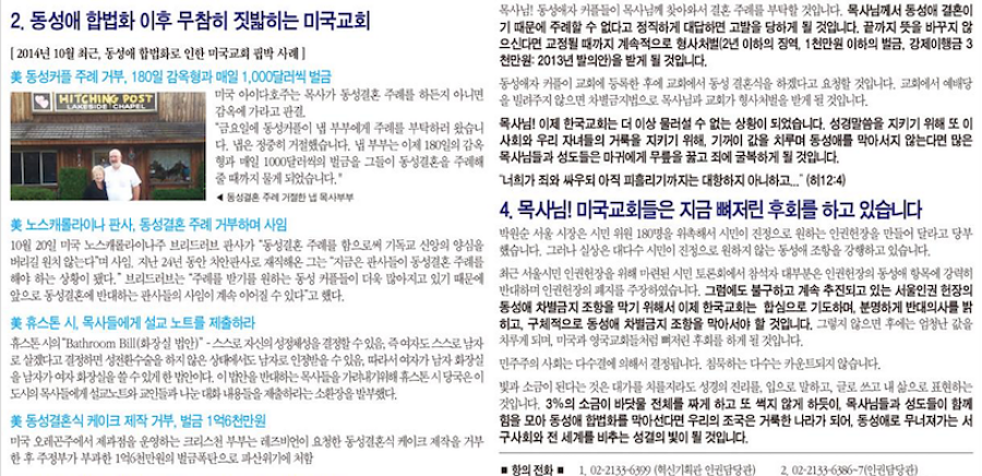 한가모가 올린 기사는 한국 <크리스천투데이>와 미국 폭스 뉴스 기사다. 아이다호주 냅 목사 부부가 동성 결혼을 주례할 수 없다고 했는데, 계속 이렇게 주장할 경우 벌금을 내거나 투옥될 수도 있다는 내용이다.