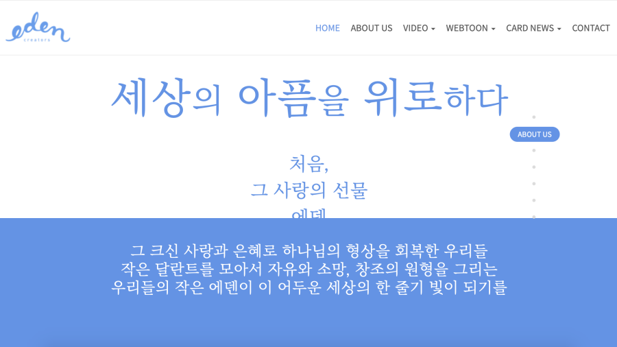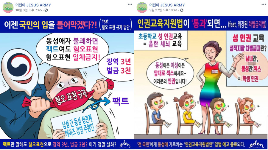 이 같은 웹툰을 제작하는 '에덴크리에이터즈'는 어떤 단체일까. 에덴크리에이터즈는 "빛을 전파하고 어두움에 맞서는 창과 방패, 영상, 웹툰, 카드 뉴스, 말씀 카드, 캘리그래피 등 모바일 기반 기독 청년 문화 선교 프로덕션"이라고 자신들을 소개한다. 그러나 이런 소개가 무색하게, 이들의 콘텐츠는 동성애·국가인권정책기본계획(NAP)·차별금지법 등의 인권 정책 반대에 집중돼 있다.