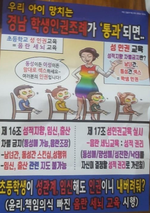 [뉴스앤조이-장명성 기자] 경남 양산의 초등학교 앞에서 '초등학교 성 인권 교육 = 음란 세뇌 교육', '동성 간, 남녀 간 섹스 = 학생 인권'이라는 문구가 적힌 전단이 배포됐다. 전단에는 만화 한 컷이 담겨 있었다. 한 교사가 어린 학생들에게 "동성이든 이성이든 맘대로 섹스하세요. 여러분의 인권입니다"라고 말하는 장면이다.