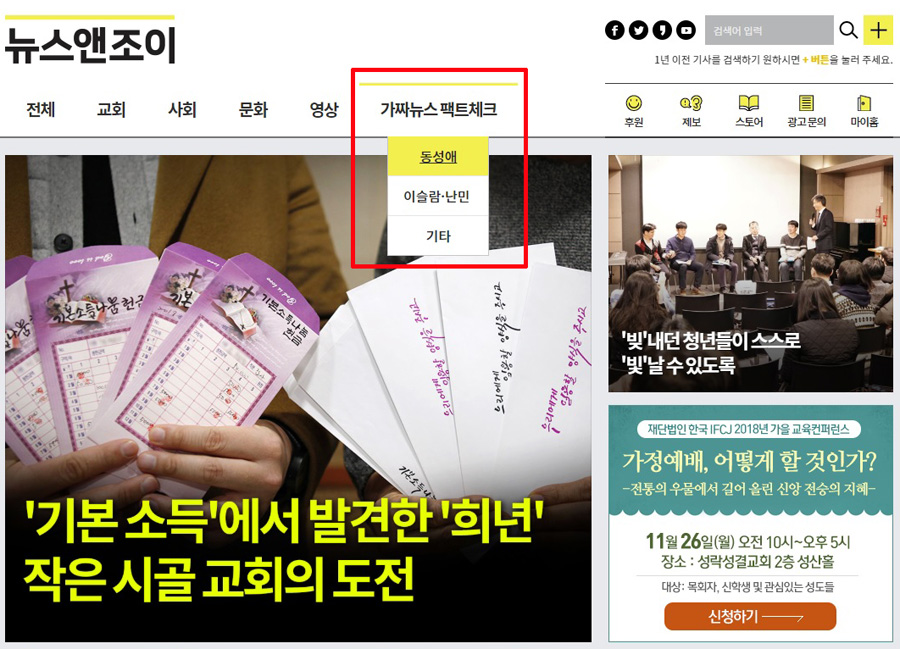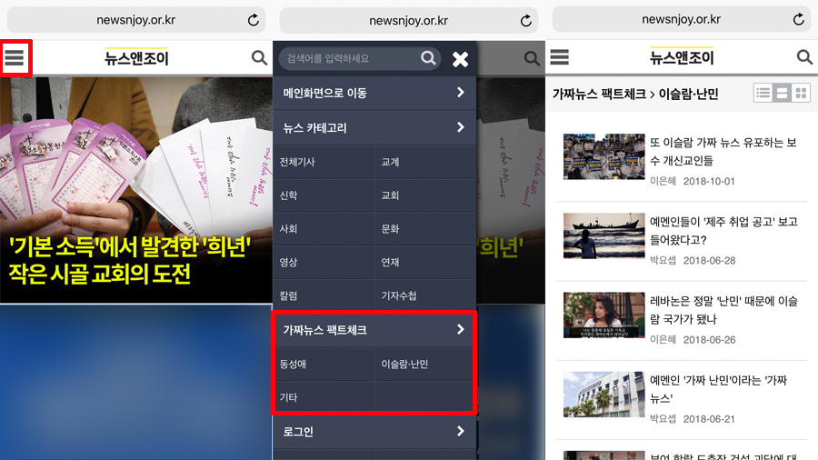 모바일 버전에서는 왼쪽 상단 '메뉴' 탭을 누르시면 아랫부분에 '가짜 뉴스 팩트 체크' 탭을 보실 수 있습니다. PC 버전에서는 메인 페이지 메뉴 바에서 찾으실 수 있습니다. '동성애', '이슬람·난민', '기타'로 나뉘어 있고, '가짜 뉴스 팩트 체크' 탭 자체를 누르면 사실 검증 기사를 모아 보실 수 있습니다.