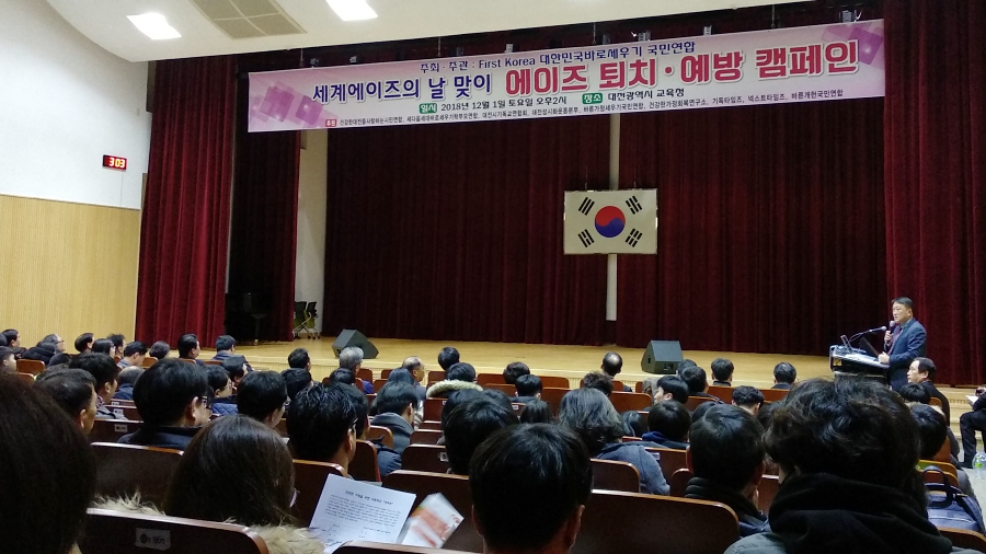 하지만 같은 날 대전광역시 교육청 대강당에서 열린 세계에이즈의날 행사는 HIV/AIDS 인식 개선과는 거리가 멀었다. 주최 단체는 퍼스트코리아대한민국바로세우기국민연합(퍼스트코리아)이었다. 지난해 12월 대전 지역 교회들이 동성애·이슬람 문제에 공동 대응하겠다는 목표를 가지고 설립한 단체로, 오정호 목사(새로남교회)가 대표회장을 맡고 있다.