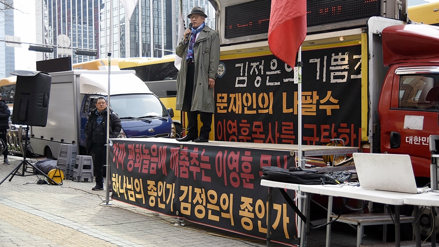 [뉴스앤조이-이용필 기자] 북한 김정은 국무위원장이 방한하면 환영해야 한다고 발언한 이영훈 목사(여의도순복음교회)가 졸지에 극우 성향 시민단체들의 표적이 됐다. 보수 단체들이 속한 자유연대(이희범 대표)는 12월 2일 여의도순복음교회 인근에서 이 목사를 규탄하며 발언을 취소하라고 외쳤다.