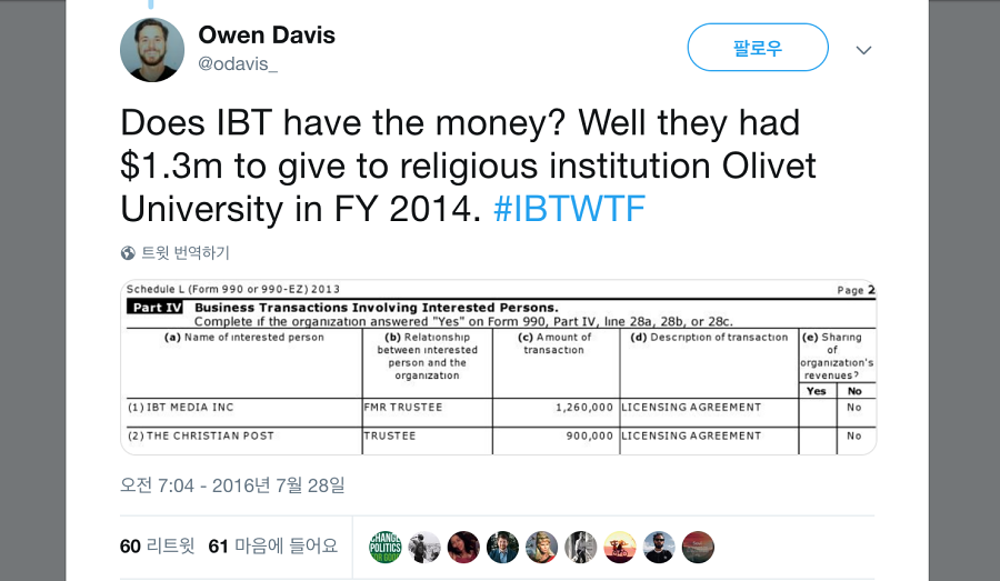 #IBTWTF 운동에 앞장선 오웬 데이비스 전 기자는 트위터에 사진 한 장을 올렸다. 사진은 올리벳대의 2014년 재정 감사 결과서 일부였다. 이 문서에는 모기업 IBT미디어가 전 이사 자격으로 올리벳대에 14억 원을 기부했다는 내용이 담겨 있었다. IBT미디어는 올리벳대에 '산학협동'이라는 이름으로 기부를 지속했는데, 정작 기자들에게는 임금을 제때 지불하지 않은 것이다.
