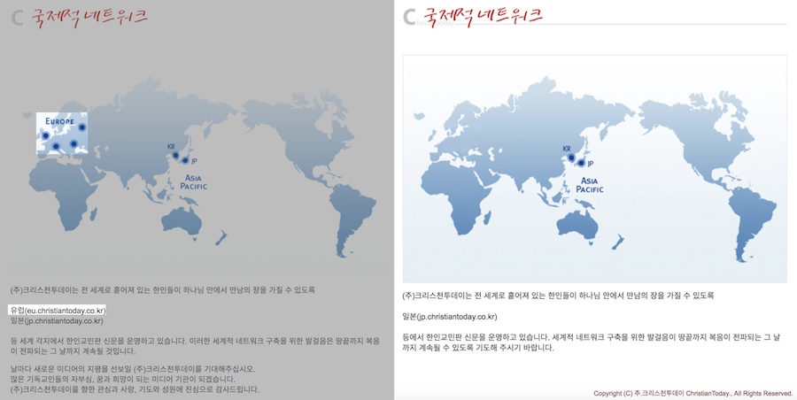 또 <크리스천투데이> 홈페이지 회사 소개에서 '국제적 네트워크' 면을 클릭하면 일본(jp.christiantoday.co.kr)과 유럽(eu.christiantoday.co.kr)에서 한인 교민 신문을 운영한다고 소개하고 있는데, 유럽 주소를 클릭하면 <기독일보> 영문판 사이트(http://www.christianitydaily.com)로 연결된다. <크리스천투데이>는 최근 유럽 주소를 삭제했다.