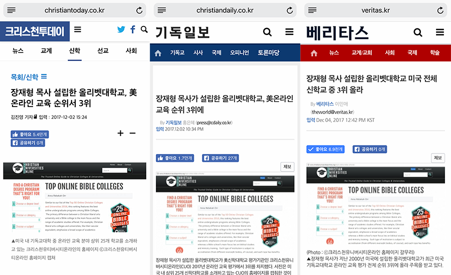 장재형 목사 설립한 올리벳대학교, 美 온라인 교육 순위서 3위 (<크리스천투데이>, 2017년 12월 2일)