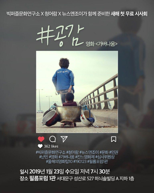 빅퍼즐문화연구소와 청어람ARMC, <뉴스앤조이>는 영화 '가버나움'이 공식 개봉하기 하루 전날 1월 23일에 공동 시사회를 연다. <뉴스앤조이> 후원자라면 동반 1인까지 관람을 신청할 수 있다. 서울 서대문구 대신동 필름포럼에서 저녁 7시 30분에 시작한다. 영화 관람 후에는 청어람 ARMC 양희송 대표가 진행하는 관객과의 대화가 이어진다.