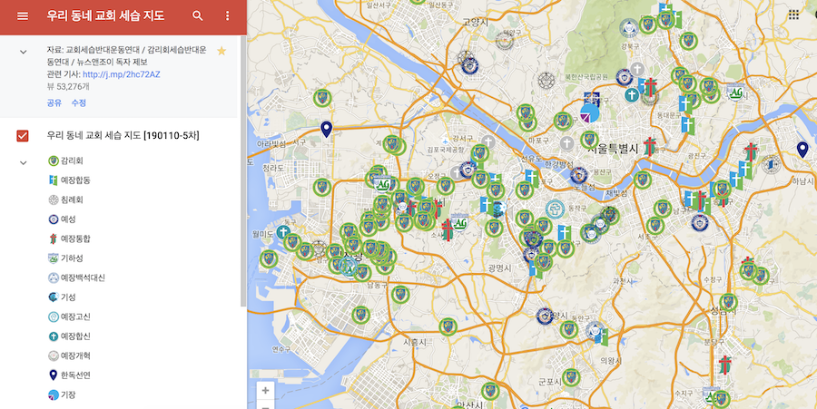 [뉴스앤조이-최승현 기자] <뉴스앤조이>가 2019년을 맞아 전국 세습 교회 현황을 업데이트했다. 2017년 4월 전국 교회 120곳의 세습 현황을 처음 공개한 후, 1주일 만에 제보 50여 건이 들어와 2차 업데이트를 거쳤다. 이후 2017년 10월, 2018년 1월과 8월 3차례 더 업데이트했다. 현재 세습 지도 누적 조회 수는 약 5만 3000여 회다.
