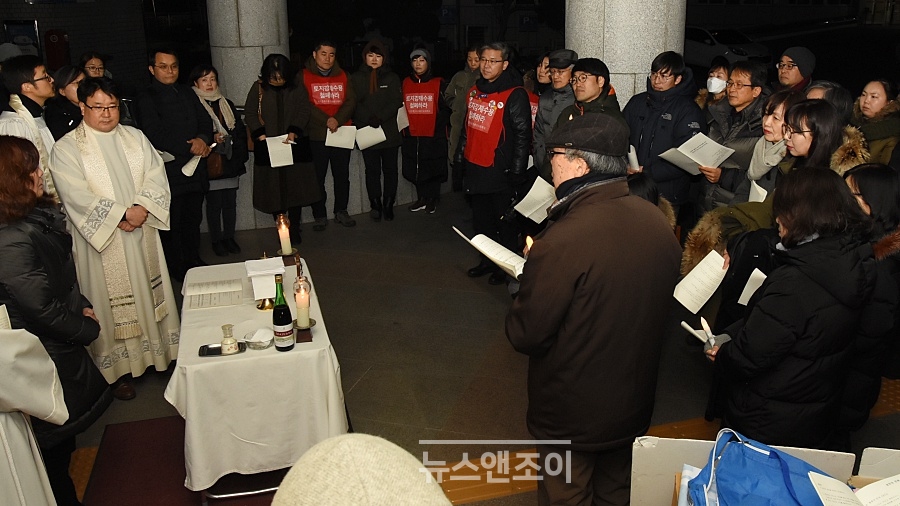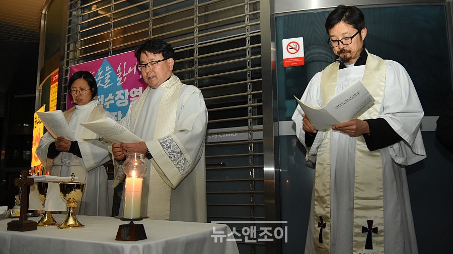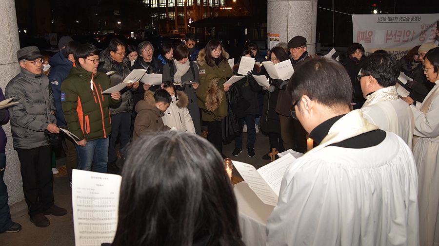 유모차에 탄 아이부터 70대 노인에 이르기까지 남녀노소 70여 명은 십자가, 성찬기가 놓인 간이 제단 앞에 빙 둘러섰다. 회사를 마치고 그대로 시청으로 달려온 이들도 있었다. 이들은 왜 추운 겨울 저녁, 보는 이 하나 없는 조용한 시청에 모였을까.