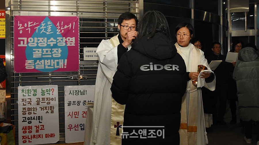 참석자들의 손에 들린 주보에는 '산황동 골프장 증설 백지화를 위한 고양시청 목요 기도회'라고 적혀 있었다. 찬송가 '뜻 없이 무릎 꿇는'과 함께 시작한 목요 기도회에서는 대한성공회 의복을 갖춰 입은 사제 세 명이 제단 뒤편에 서서 성공회 전례에 따른 성찬례를 진행했다.